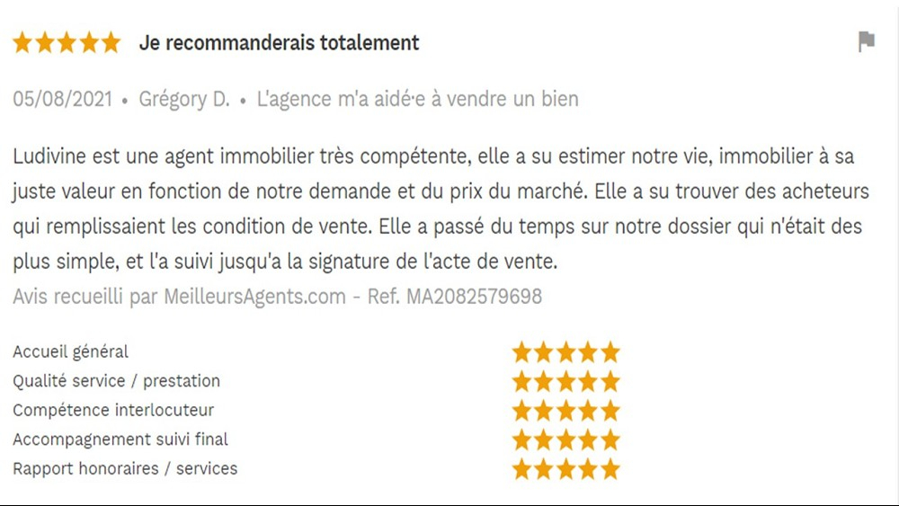 Ludivine est une agent immobilier très compétente, elle a su estimer notre vie, immobilier à sa juste valeur en fonction de notre demande et du prix du marché. Elle a su trouver des acheteurs qui remplissaient les condition de vente. Elle a passé du temps sur notre dossier qui n'était des plus simple, et l'a suivi jusqu'a la signature de l'acte de vente.