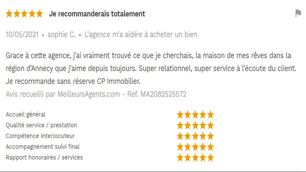Avis 5 étoiles site Meilleurs agents pour agences immobilières à Annecy CP IMMOBILIER 10/05/2021
