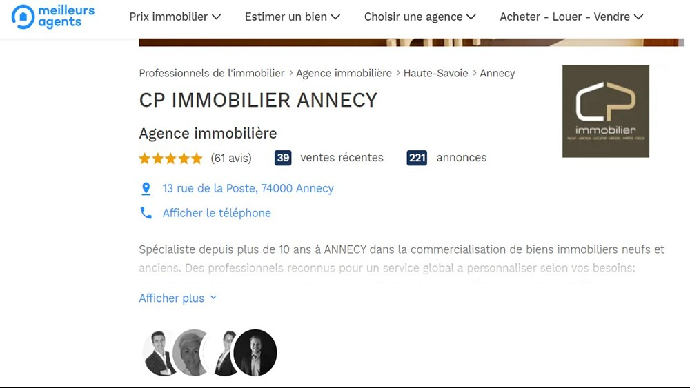 A ce jour la notation de l'agence CP IMMOBILIER sur le site professionnel Meilleurs agents, dans la partie agences immobilieres à 74000 Annecy, est de 5 ETOILES sur 61 avis clients !